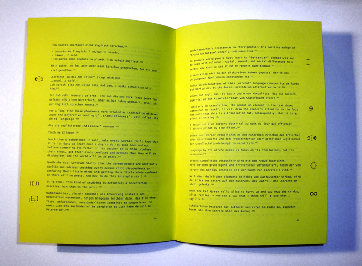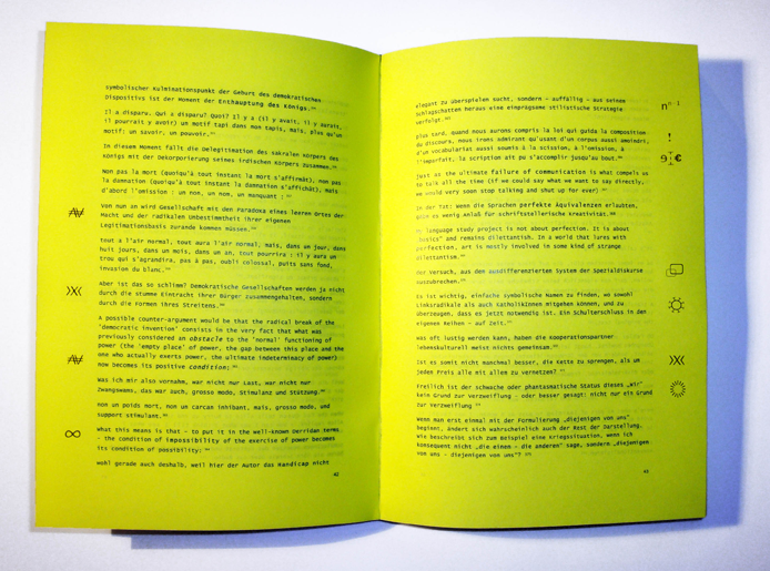 Der Verlauf des Gesprächs zwischen den beteiligten Sprechpositionen erfolgt nach den Grundsätzen des freien Redemarkts, wobei die Sprecher und Sprecherinnen innerhalb des Haupttextes (leuchtmarkerfarben) anonym bleiben, außerhalb dessen aber im Sprecherverzeichnis (Fußnotentext, weiß) transparent gemacht sind. So ist eine sowohl romantische wie auch archäologische Lektüre möglich.
