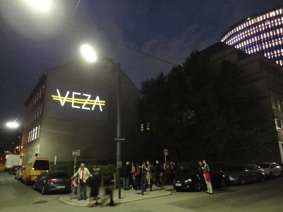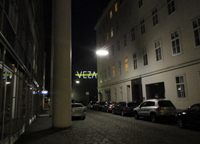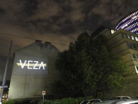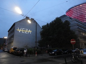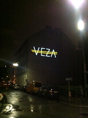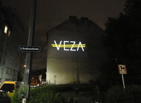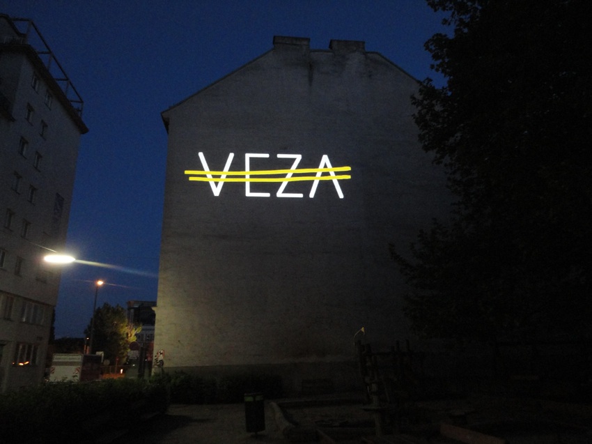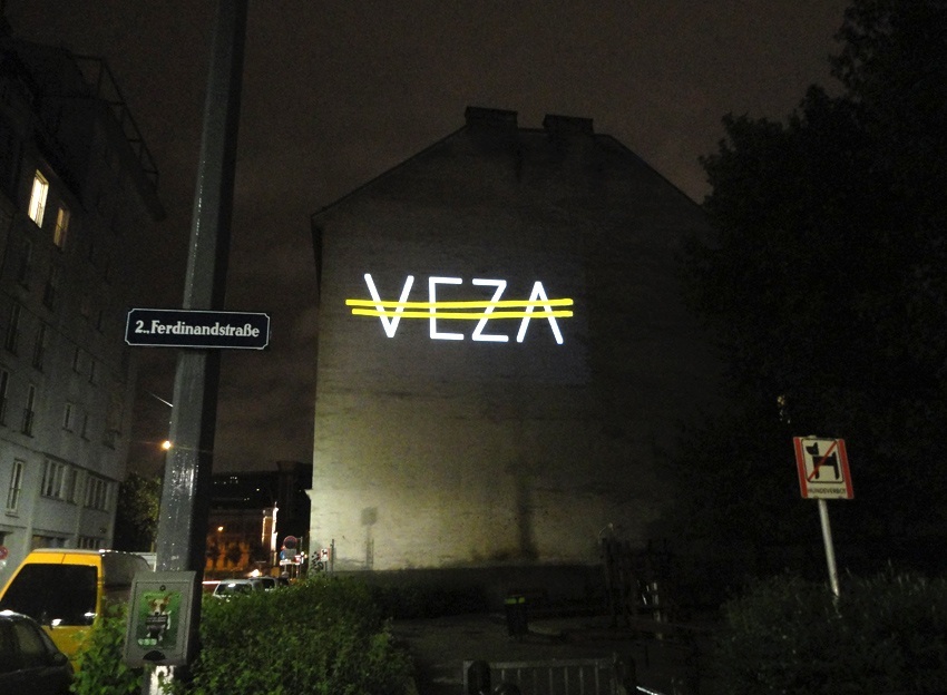 Das Zeichen „VEZA fehlt“ basiert auf dem Auslassungszeichen und bezieht sich auf Veza Canettis bekannten Roman „Die Gelbe Straße“, der das Leben in der Ferdinandstraße, der Straße der Lederhändler in den 1930er Jahren portraitiert. „Es ist eine merkwürdige Straße … Es wohnen da Krüppel, Mondsüchtige, Verrückte, Verzweifelte und Satte.“ Der Buchstabe V mit einem Querstrich markiert ein Fehlen, bei einem doppelten Querstrich fehlt etwas Essentielles. Das projizierte Zeichen „VEZA fehlt“ unterstreicht das Fehlen einer ganzen Person: VEZA. Der doppelte Querstrich zieht sich, gleich der Gelben Straße, über alle vier Buchstaben und komplettiert diese gleichzeitig. Zudem bedeutet der Begriff „Veza“ in der bosnischen, serbischen, kroatischen Sprache, die in der heutigen Umgebung der Ferdinandstraße gesprochen wird, genau dieses: Verbindung.