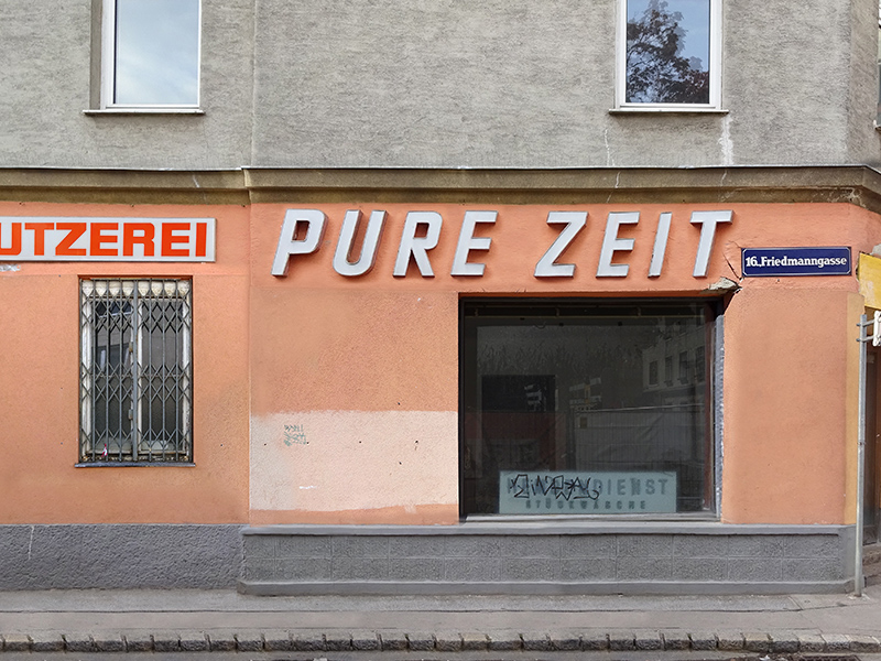 Die Ghostletters der Reklameaufschrift einer ehemaligen PUTZEREI sind an der Fassade des Lokals in der Lange Gasse 2 noch schemenhaft erkennbar. Diese Schriftspuren waren der Auslöser, bei den jetzigen Mietern, HASSMANN & liebfrau, anzuklopfen und ihnen ein Anagramm vorzuschlagen. Die Leuchtbuchstaben der abgerissenen PUTZEREI in der Friedmanngasse 68 im 16. Bezirk wurden professionell revitalisiert und montiert von der Werbewerkstatt aus der Lange Gasse 4 und als PURE ZEIT nach vielen Jahrzehnten wieder zum Leuchten gebracht: